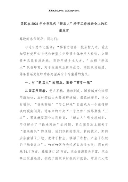 【七哥公文】2024年:某区在2024年全市现代“新农人”培育工作推进会上的汇报发言+更多免费公文+VX:QiGeGongWen2024