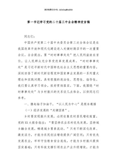/ 【七哥公文】2024年:第一书记学习党的二十届三中全会精神发言稿+更多免费公文+VX:QiGeGongWen2024