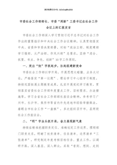 【七哥公文】2024年:市委社会工作部部长、市委“两新”工委书记在社会工作会议上的汇报发言+更多免费公文+VX:QiGeGongWen2024