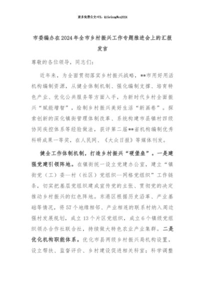 【七哥公文】2024年:市委编办在2024年全市乡村振兴工作专题推进会上的汇报发言+更多免费公文+VX:QiGeGongWen2024