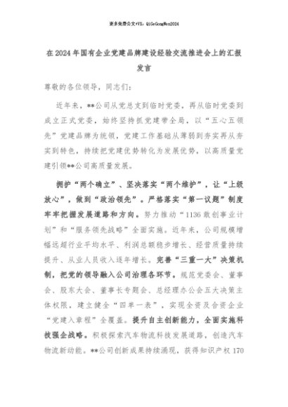 【七哥公文】2024年:在2024年国有企业党建品牌建设经验交流推进会上的汇报发言+更多免费公文+VX:QiGeGongWen2024