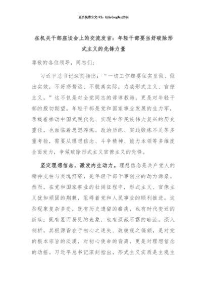 【七哥公文】2024年:在机关干部座谈会上的交流发言:年轻干部要当好破除形式主义的先锋力量+更多免费公文+VX:QiGeGongWen2024