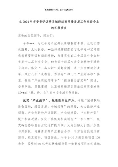 【七哥公文】2024年:在2024年市委书记调研县域经济高质量发展工作座谈会上的汇报发言+更多免费公文+VX:QiGeGongWen2024