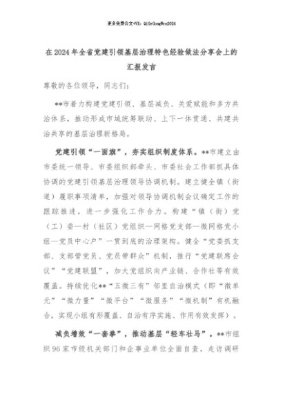 【七哥公文】2024年:在2024年全省党建引领基层治理特色经验做法分享会上的汇报发言+更多免费公文+VX:QiGeGongWen2024