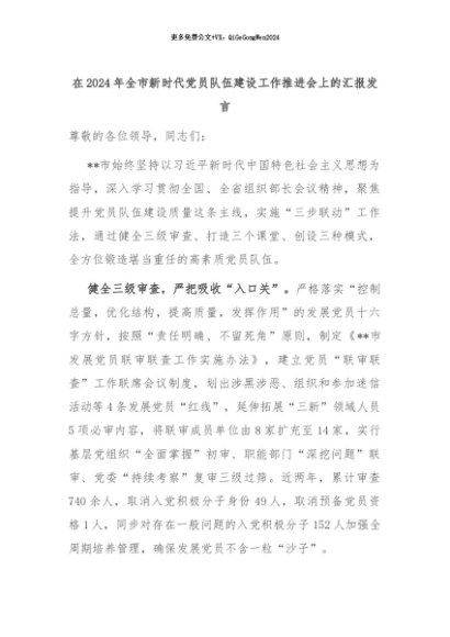 【七哥公文】2024年:在2024年全市新时代党员队伍建设工作推进会上的汇报发言+更多免费公文+VX:QiGeGongWen2024