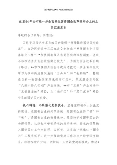 【七哥公文】2024年:在2024年全市进一步全面深化国资国企改革推动会上的上的汇报发言+更多免费公文+VX:QiGeGongWen2024