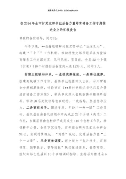 【七哥公文】2024年:在2024年全市村党支部书记后备力量培育储备工作专题推进会上的汇报发言+更多免费公文+VX:QiGeGongWen2024