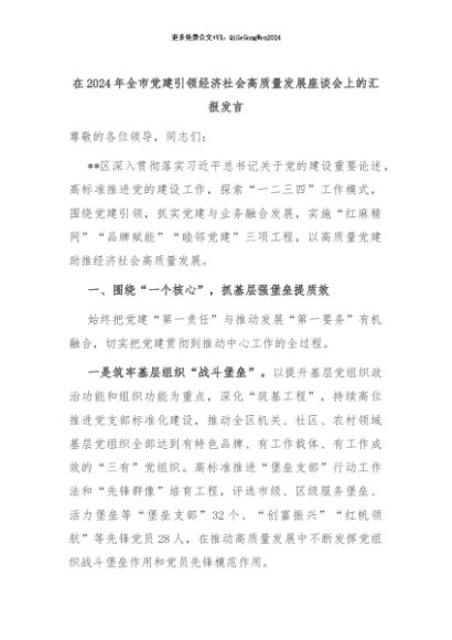 【七哥公文】2024年:在2024年全市党建引领经济社会高质量发展座谈会上的汇报发言+更多免费公文+VX:QiGeGongWen2024