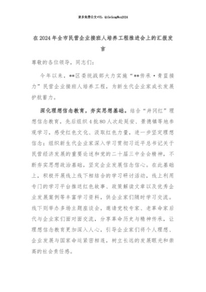 【七哥公文】2024年:在2024年全市民营企业接班人培养工程推进会上的汇报发言+更多免费公文+VX:QiGeGongWen2024