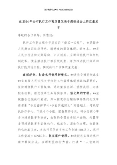 【七哥公文】2024年:在2024年全市执行工作高质量发展专题推进会上的汇报发言+更多免费公文+VX:QiGeGongWen2024