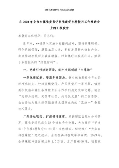 【七哥公文】2024年:在2024年全市乡镇党委书记抓党建促乡村振兴工作推进会上的汇报发言+更多免费公文+VX:QiGeGongWen2024