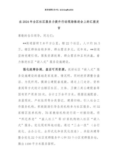 【七哥公文】2024年:在2024年全区社区服务力提升行动现场推进会上的汇报发言+更多免费公文+VX:QiGeGongWen2024