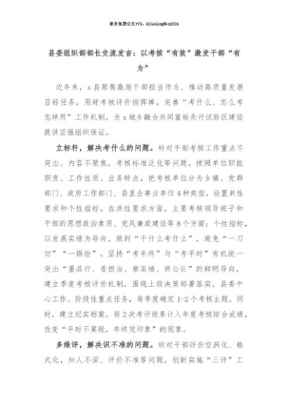 【七哥公文】2024年:县委组织部部长交流发言:以考核“有效”激发干部“有为”+更多免费公文+VX:QiGeGongWen2024