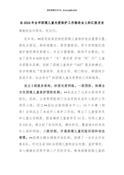 【七哥公文】2024年:在2024年全市困境儿童关爱保护工作推进会上的汇报发言+更多免费公文+VX:QiGeGongWen2024