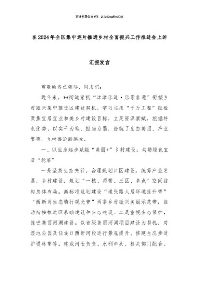 【七哥公文】2024年:在2024年全区集中连片推进乡村全面振兴工作推进会上的汇报发言+更多免费公文+VX:QiGeGongWen2024
