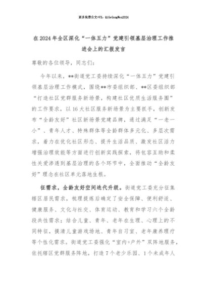 【七哥公文】2024年:在2024年全区深化“一体五力”党建引领基层治理工作推进会上的汇报发言+更多免费公文+VX:QiGeGongWen2024
