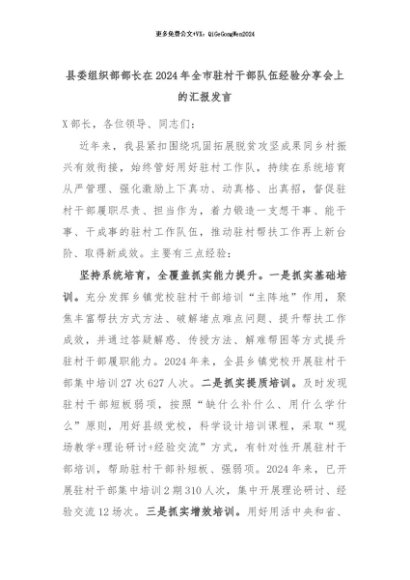 【七哥公文】2024年:县委组织部部长在2024年全市驻村干部队伍经验分享会上的汇报发言+更多免费公文+VX:QiGeGongWen2024