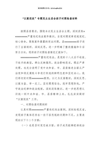 / 【七哥公文】2024年:“以案促改”专题民主生活会班子对照检查材料+更多免费公文+VX:QiGeGongWen2024