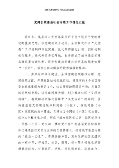 / 【七哥公文】2024年:党建引领基层社会治理工作情况汇报+更多免费公文+VX:QiGeGongWen2024