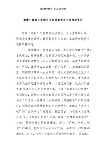 / 【七哥公文】2024年:党建引领非公有制企业高质量发展工作情况汇报+更多免费公文+VX:QiGeGongWen2024