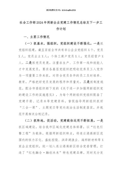 【七哥公文】2024年:社会工作部2024年两新企业党建工作情况总结及下一步工作计划+更多免费公文+VX:QiGeGongWen2024