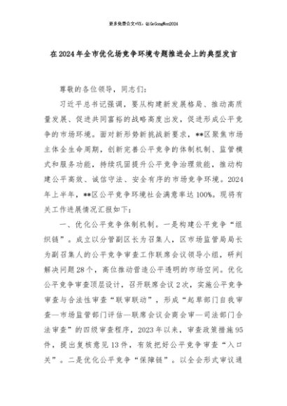 【七哥公文】2024年:在2024年全市优化场竞争环境专题推进会上的典型发言+更多免费公文+VX:QiGeGongWen2024