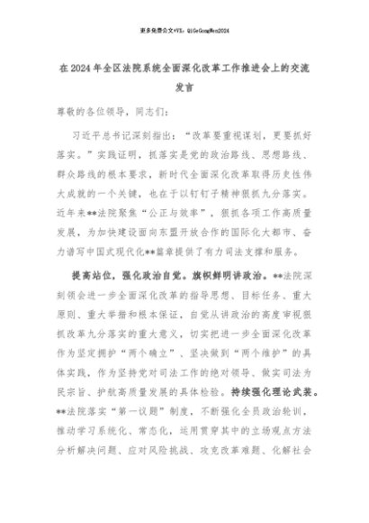 【七哥公文】2024年:在2024年全区法院系统全面深化改革工作推进会上的交流发言+更多免费公文+VX:QiGeGongWen2024
