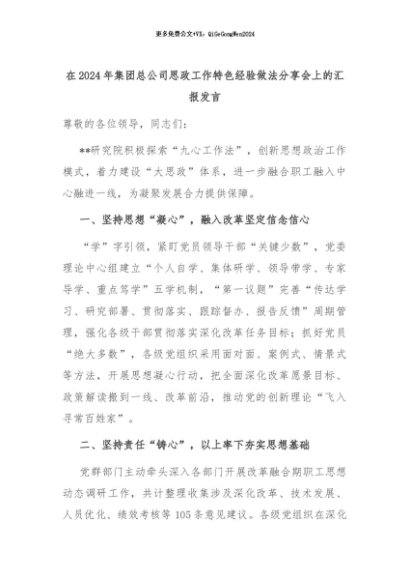 【七哥公文】2024年:在2024年集团总公司思政工作特色经验做法分享会上的汇报发言+更多免费公文+VX:QiGeGongWen2024