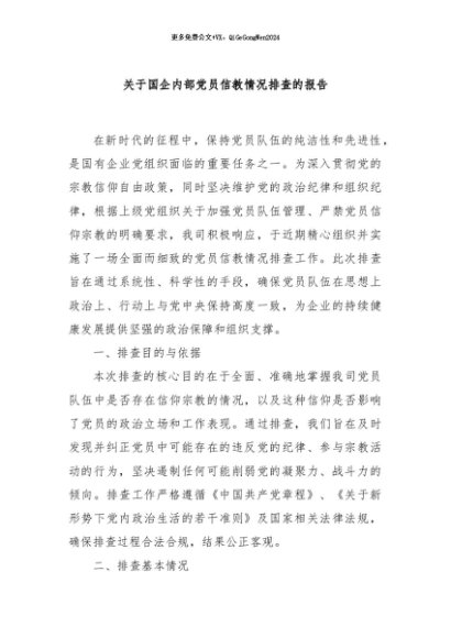 / 【七哥公文】2024年:关于国企内部党员信教情况排查的报告+更多免费公文+VX:QiGeGongWen2024