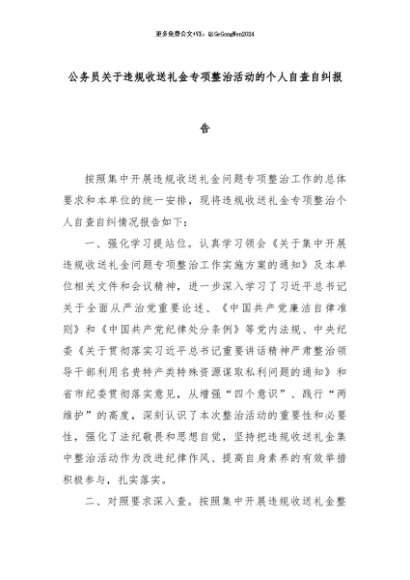 【七哥公文】2024年:公务员关于违规收送礼金专项整治活动的个人自查自纠报告+更多免费公文+VX:QiGeGongWen2024