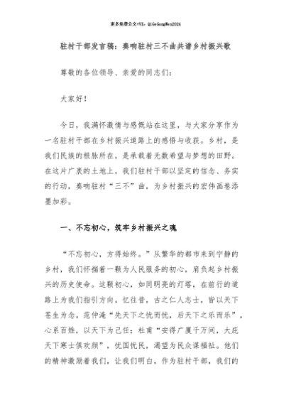 / 【七哥公文】2024年:驻村干部发言稿:奏响驻村三不曲共谱乡村振兴歌+更多免费公文+VX:QiGeGongWen2024