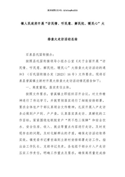 【七哥公文】2024年:镇人民政府开展“访民情、听民意、解民忧、暖民心”大排查大走访活动总结+更多免费公文+VX:QiGeGongWen2024