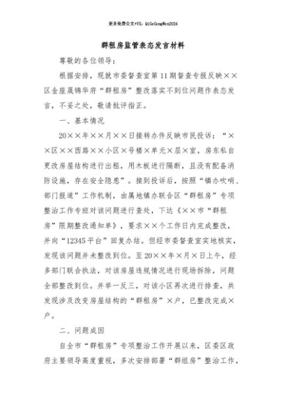 / 【七哥公文】2024年:群租房监管表态发言材料+更多免费公文+VX:QiGeGongWen2024