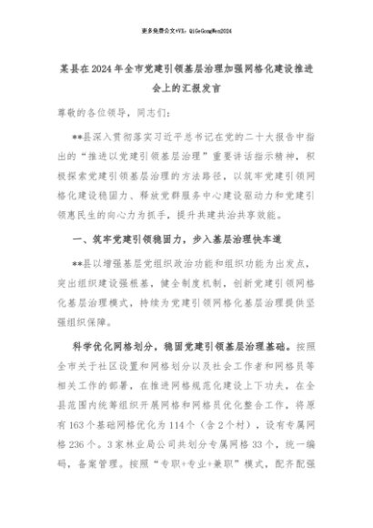 【七哥公文】2024年:某县在2024年全市党建引领基层治理加强网格化建设推进会上的汇报发言+更多免费公文+VX:QiGeGongWen2024