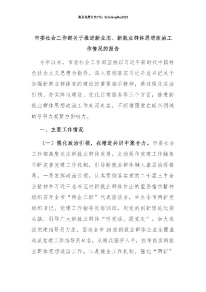 【七哥公文】2024年:市委社会工作部关于推进新业态、新就业群体思想政治工作情况的报告+更多免费公文+VX:QiGeGongWen2024