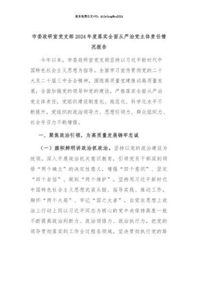 【七哥公文】2024年:市委政研室党支部2024年度落实全面从严治党主体责任情况报告+更多免费公文+VX:QiGeGongWen2024