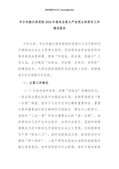 【七哥公文】2024年:市乡村振兴局党组2024年落实全面从严治党主体责任工作情况报告+更多免费公文+VX:QiGeGongWen2024