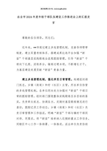 【七哥公文】2024年:在全市2024年度年轻干部队伍建设工作推进会上的汇报发言+更多免费公文+VX:QiGeGongWen2024