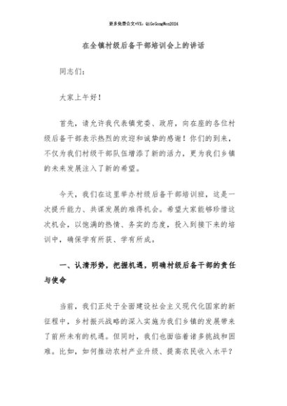 / 【七哥公文】2024年:在全镇村级后备干部培训会上的讲话+更多免费公文+VX:QiGeGongWen2024