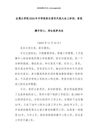 【七哥公文】2024年:在愚公学校2024年冬学段家长委员代表大会上讲话:家校携手同心,师生筑梦未来+更多免费公文+VX:QiGeGongWen2024