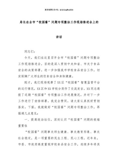 【七哥公文】2024年:局长在全市“校园餐”问题专项整治工作现场推进会上的讲话+更多免费公文+VX:QiGeGongWen2024