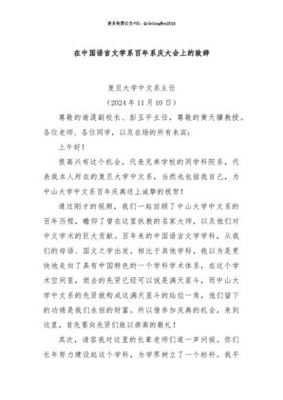 / 【七哥公文】2024年:在中国语言文学系百年系庆大会上的致辞+更多免费公文+VX:QiGeGongWen2024