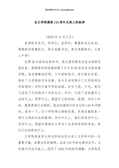 【七哥公文】2024年:在文学院建院110周年庆典上的致辞+更多免费公文+VX:QiGeGongWen2024