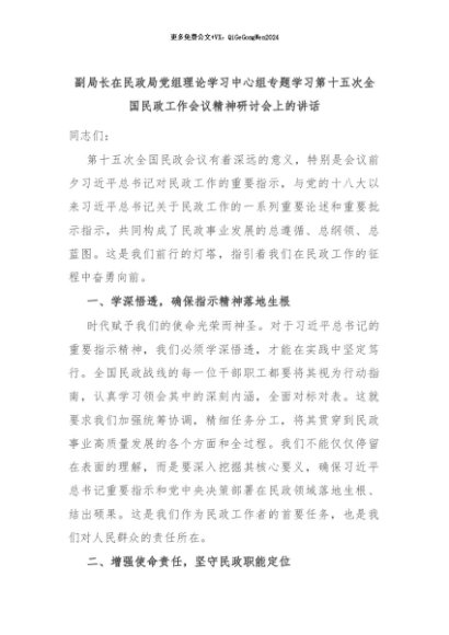 【七哥公文】2024年:副局长在民政局党组理论学习中心组专题学习第十五次全国民政工作会议精神研讨会上的讲话+更多免费公文+VX:QiGeGongWen2024