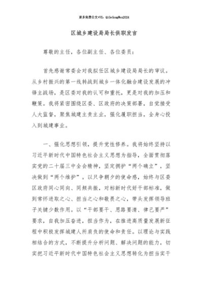 / 【七哥公文】2024年:区城乡建设局局长供职发言+更多免费公文+VX:QiGeGongWen2024