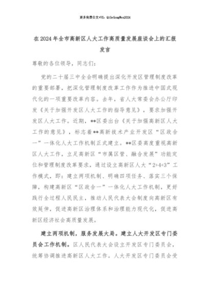 【七哥公文】2024年:在2024年全市高新区人大工作高质量发展座谈会上的汇报发言+更多免费公文+VX:QiGeGongWen2024