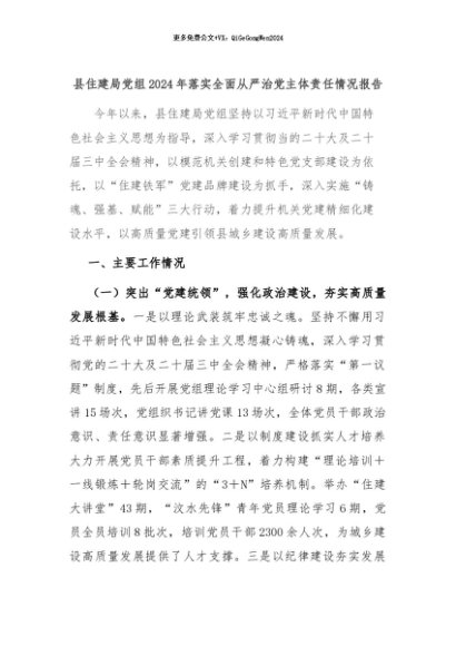 【七哥公文】2024年:县住建局党组2024年落实全面从严治党主体责任情况报告+更多免费公文+VX:QiGeGongWen2024