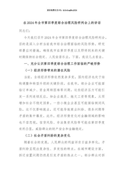 【七哥公文】2024年:在2024年全市第四季度综合治理风险研判会上的讲话+更多免费公文+VX:QiGeGongWen2024
