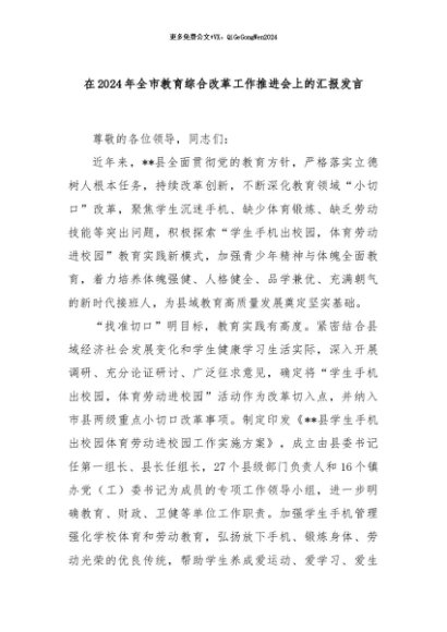 【七哥公文】2024年:在2024年全市教育综合改革工作推进会上的汇报发言+更多免费公文+VX:QiGeGongWen2024
