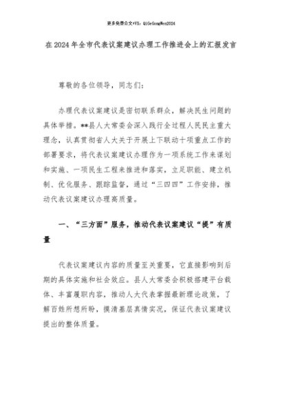 【七哥公文】2024年:在2024年全市代表议案建议办理工作推进会上的汇报发言+更多免费公文+VX:QiGeGongWen2024
